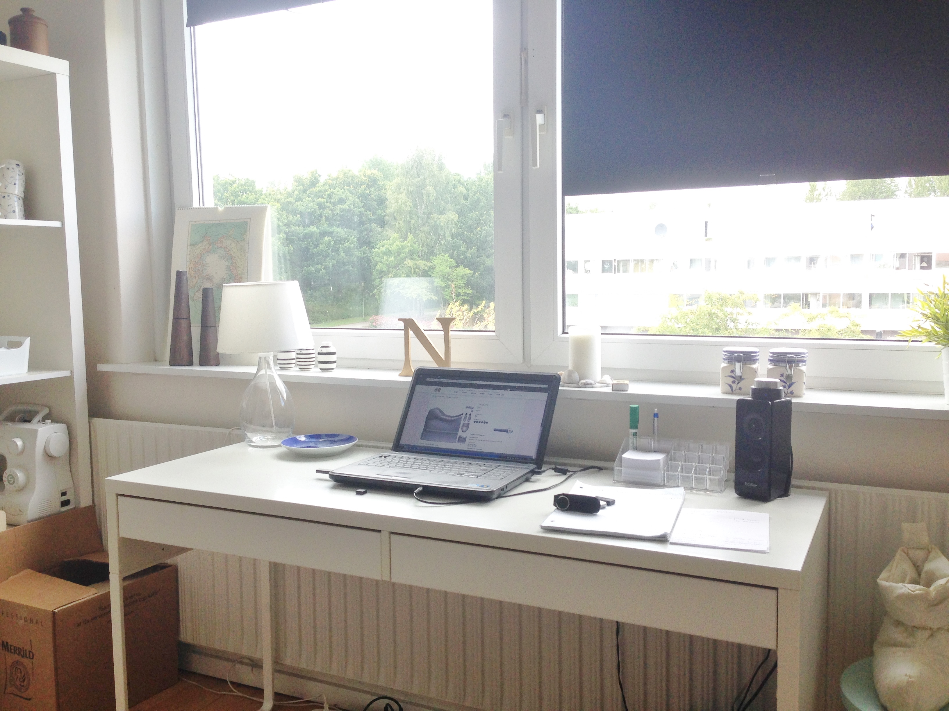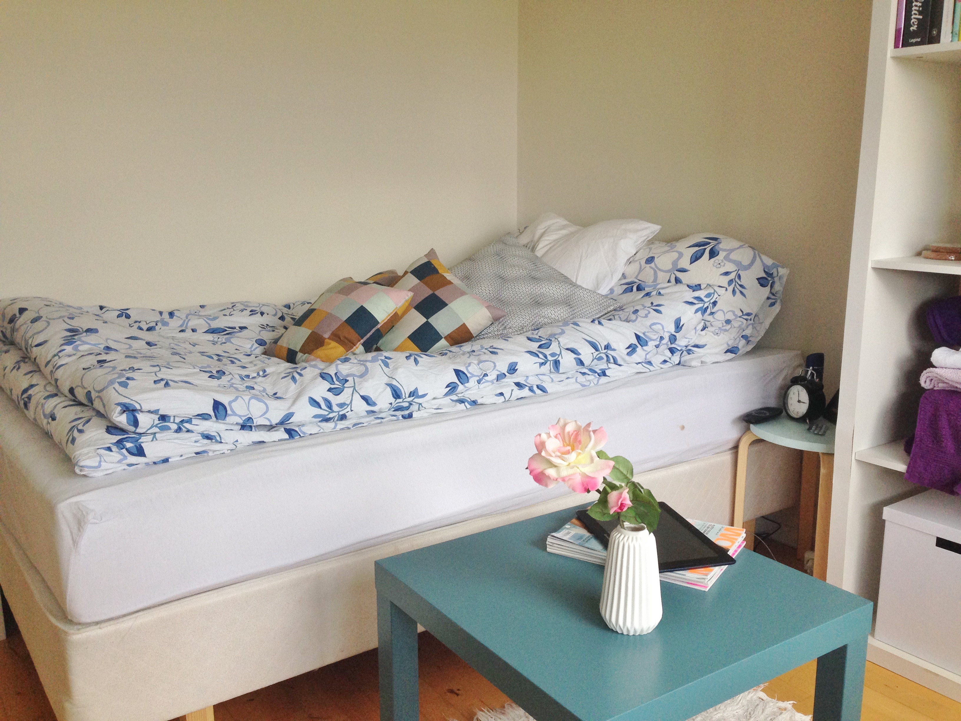 Det i ser her er ikke det færdige resultat, håber jeg også lidt i kan regne ud, haha. Men det er i hvert fald mit værelse. Jeg mangler at få hægt hylder, billeder og lamper op, også lige lidt sortering i bogreolen. Jeg kan rigtig godt lide hvordan jeg har fået mig indrettet og har stor set brugt hele min dag her inde, ved computeren og den hyggelige udsigt ned til legepladsen.