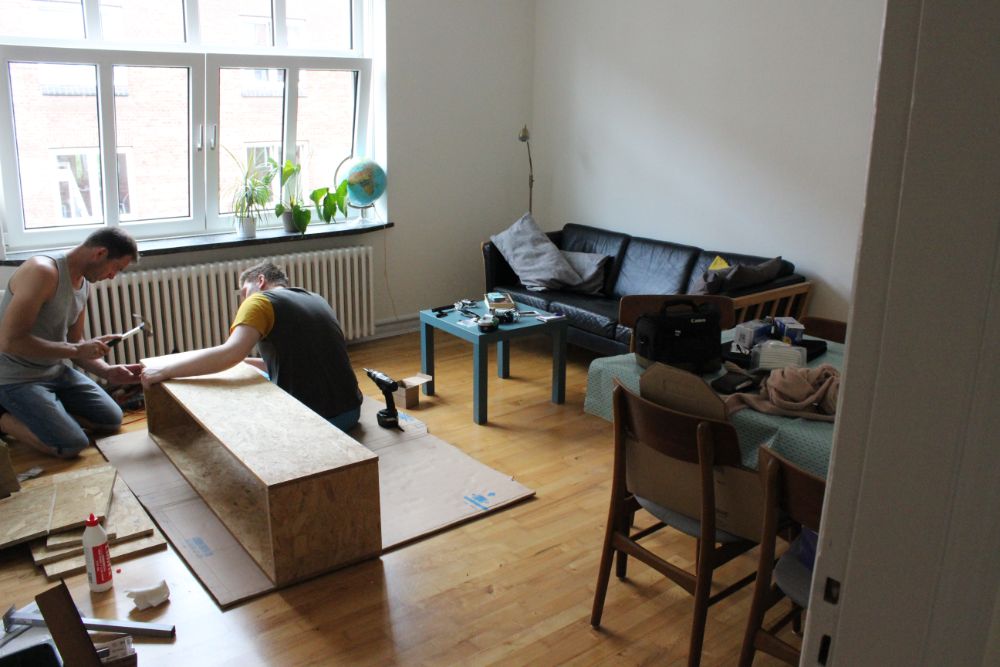 (Flyttedag – kæreste og svigerfar samler hjemmedesignet tv møbel)